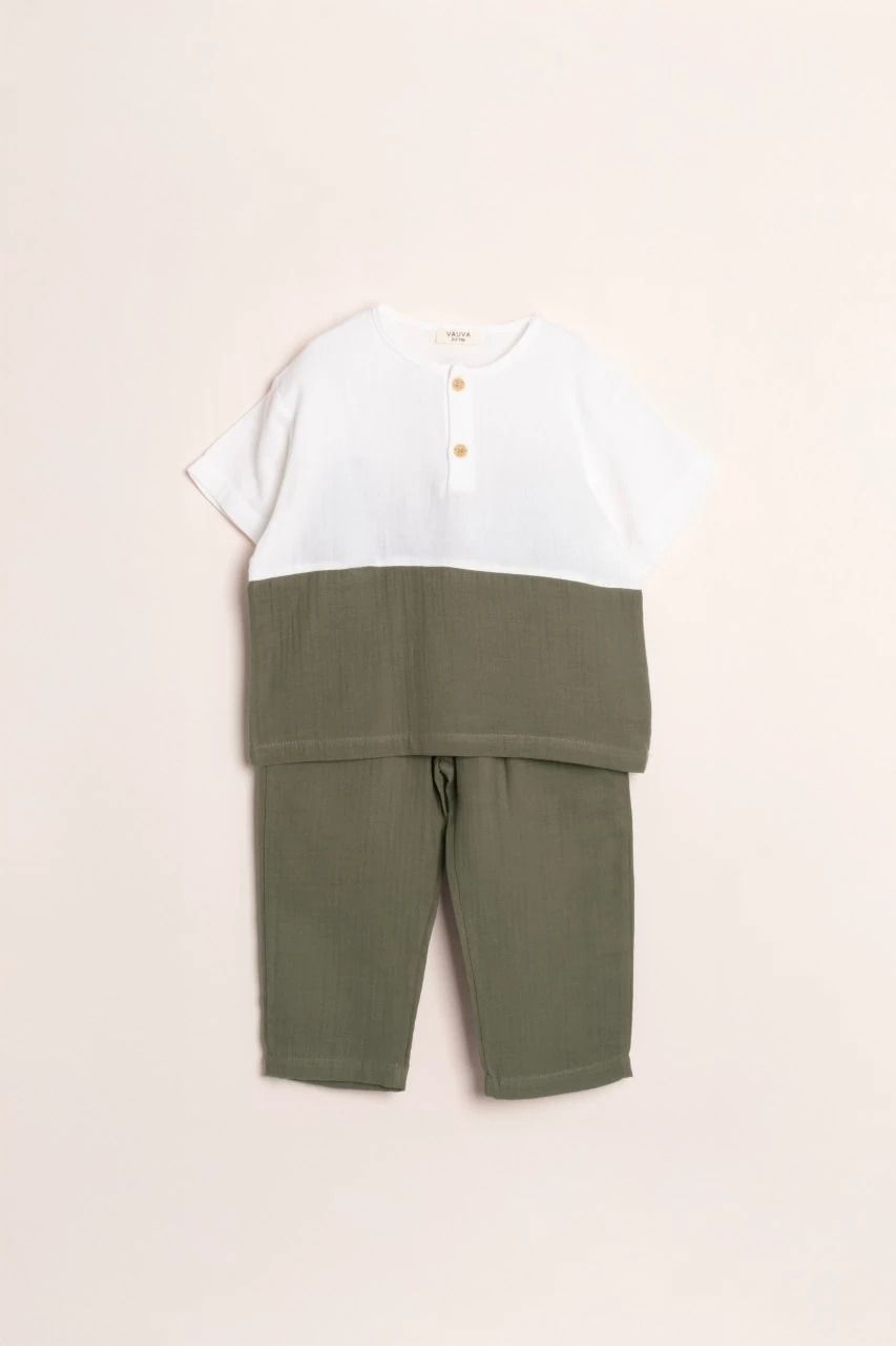 Müslin Yeşil Pantolon Takım, çocuğunuzun gardırobuna şıklık ve konfor katar. Günlük kullanımda rahatlığı ve şıklığı bir arada yaşatır.